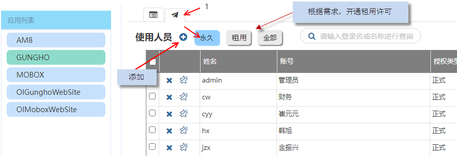 在一個(gè)授權(quán)中包含了2類(lèi)授權(quán)模式,永久許可企業(yè)一般可以設(shè)置經(jīng)常使用這系統(tǒng)用戶(hù)(主要用戶(hù))租用許可可以給那些平時(shí)不怎么用(可能一年就用 2,3次的用戶(hù))